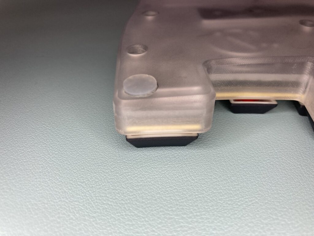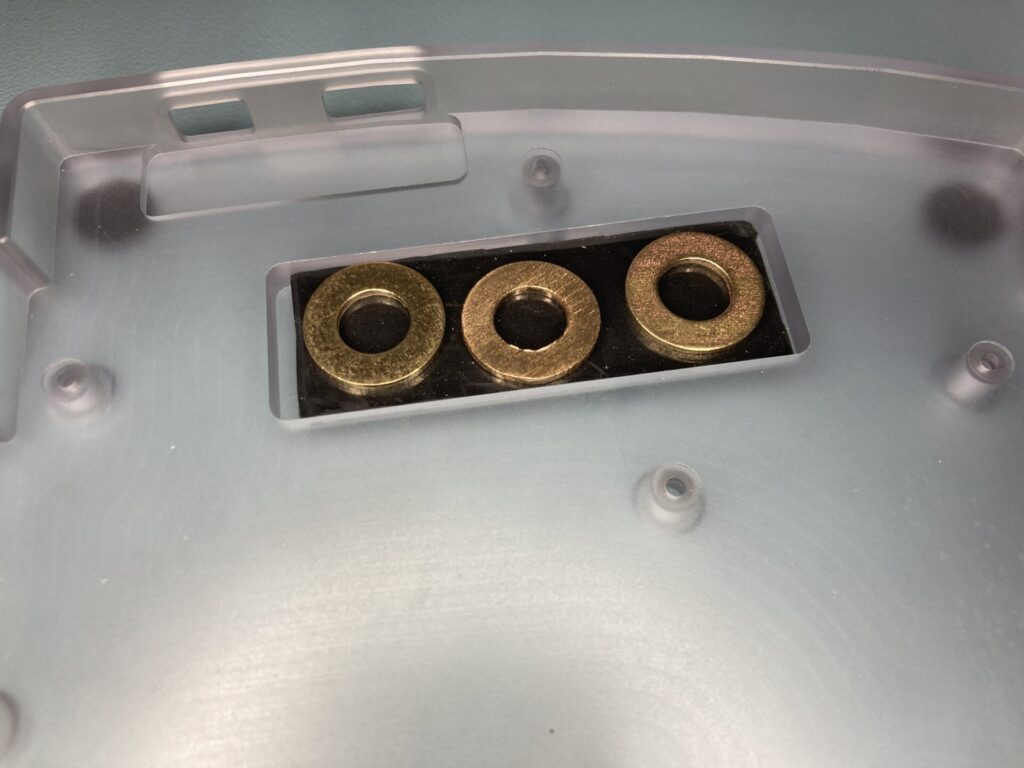 ゴム足は滑り止め性能を考えるとシリコーンゴム一択ですね。くぼみを作って飛び出し量を抑えより薄くしています。
