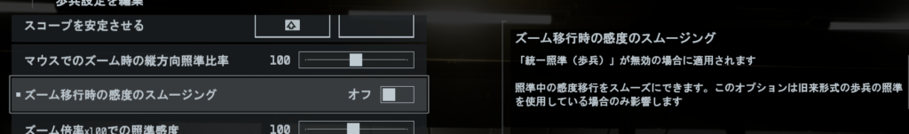 スムージングオンの場合は腰だめ感度から徐々にADS感度に移行するため、ズームしながらのエイムがしやすいと思います。
