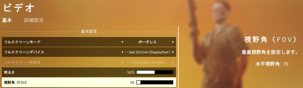 BFVでは垂直視野角を55としたとき水平視野角は70と表示されました。