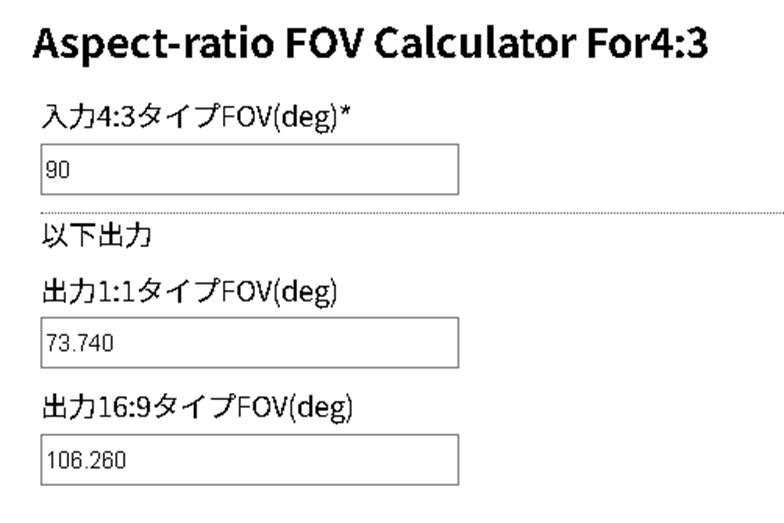 APEXはおよそ4:3タイプの水平視野角を採用しています。ので、APEXの90設定は垂直視野角に直すと73.74となります。