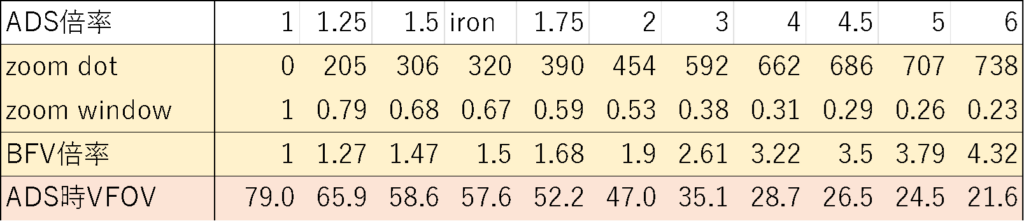 なんでBFVとそんなに比べているの?と思われたと思いますが、それはスコープズーム率は独自であるのに対し、ADS感度計算はBFV式であるからです。意味不明ですよね。私もそう思います。