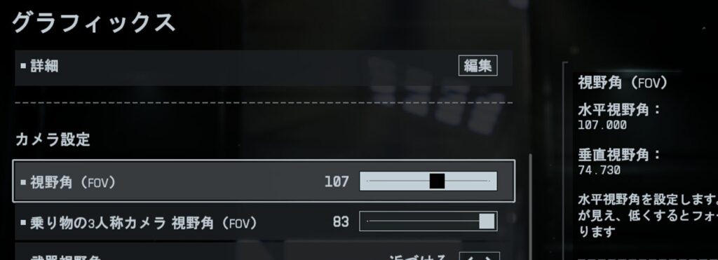 ゲーム内で結果を確認すると、VFOV73.74と読み込まれています。また16:9タイプ水平視野角は107と表示されていますが細かく見ると106.26のはずですから、水平視野角はおよその値となっていますね。