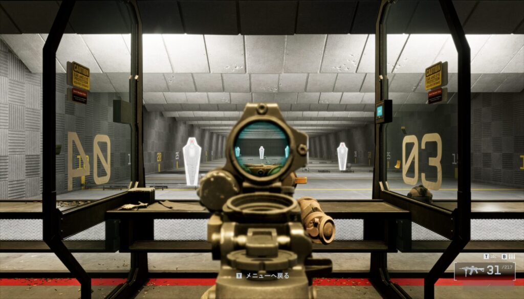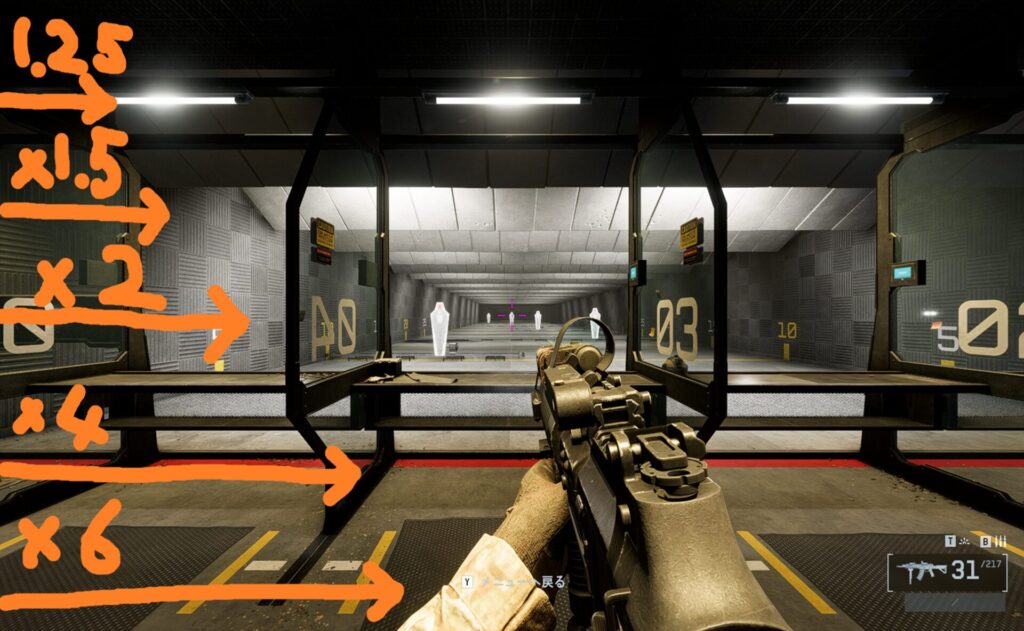 すべてではないですが各倍率を調査した結果ここまでズームすることがわかりました。今作は射撃場があるので便利ですね。また今回、私が普段使用している、VFOV79設定での値になります。