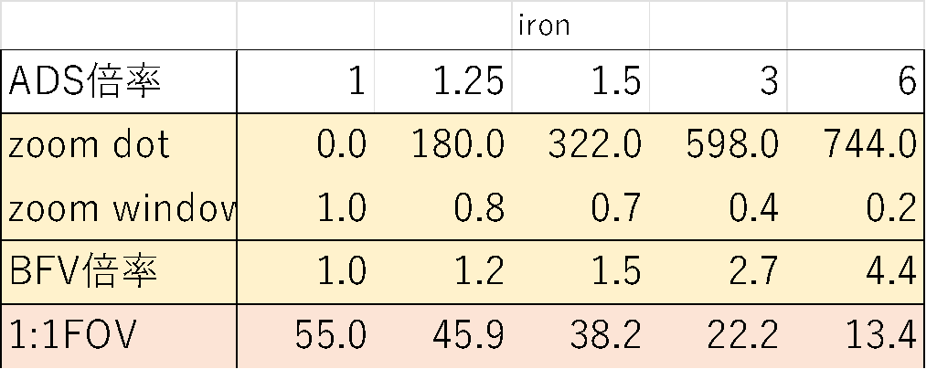 結果をまとめたものがこちらになります。アイアンサイトは1.5倍サイトよりちょっとだけズームします。設定上は1.5倍と一緒になるのでしょうか。