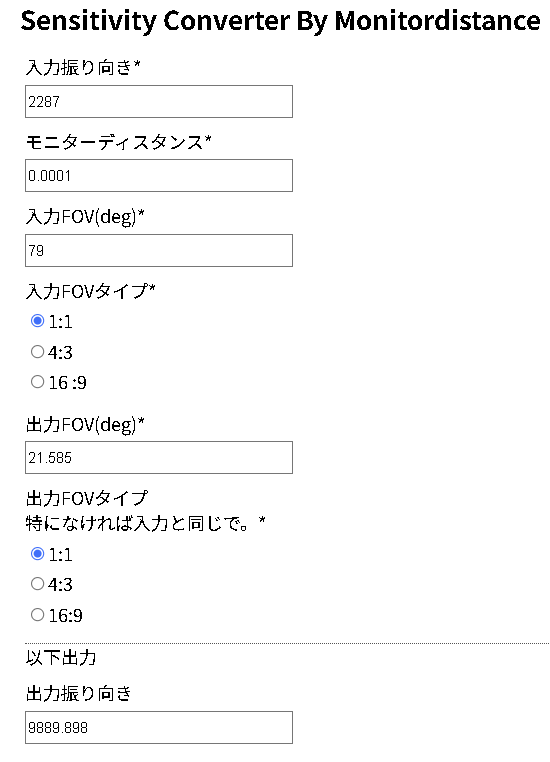 下記は、6倍スコープの時の実視野角を入力し、モニターディスタンス0% (BFV統一照準係数/1.77=モニターディスタンス)を入力しています。すると本来係数0では振り向き移動量9890程度である必要があるとわかりました。
