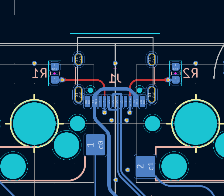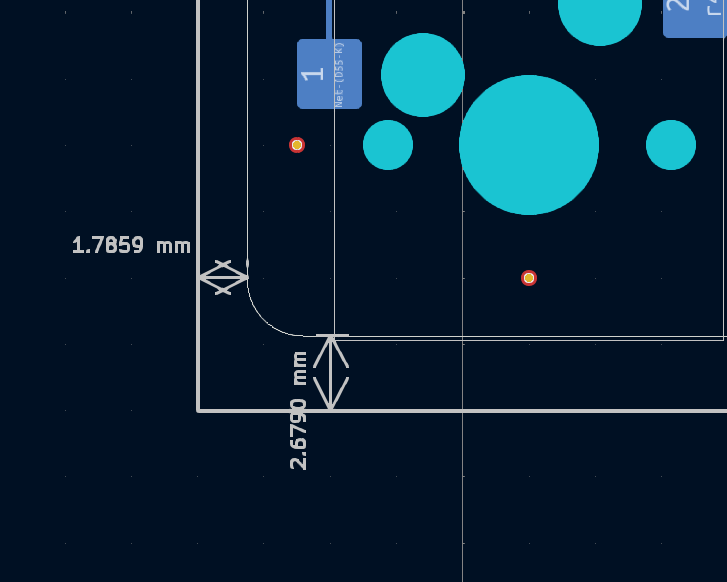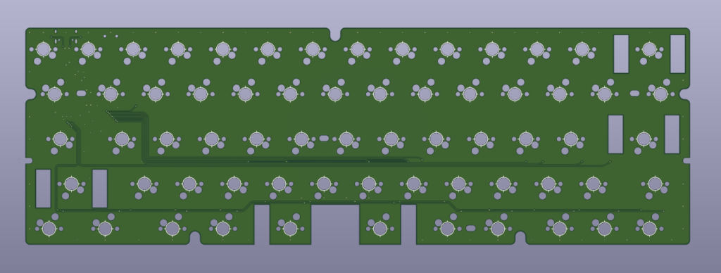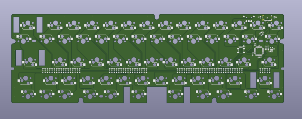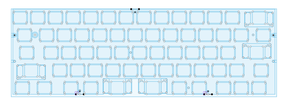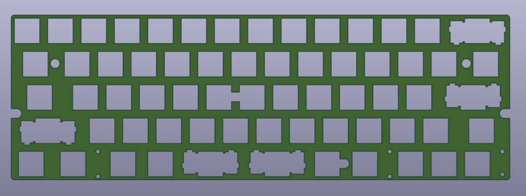 gh60ケースに対応させるために穴をあけてあります。一方でgh60マウント自体は変で好きでないので、プレートマウント用に5点スタンドオフスペーサ通す用の切り欠きを外周に設けています。60%基板はgh60穴を開けつつ、個人的なマウント用の穴もあけていくのがいいんだと思います。