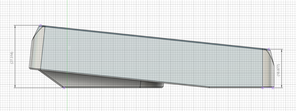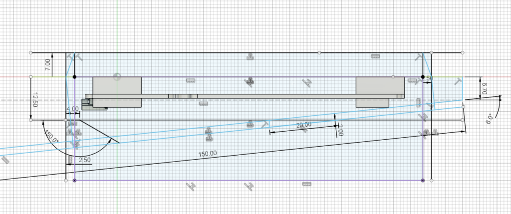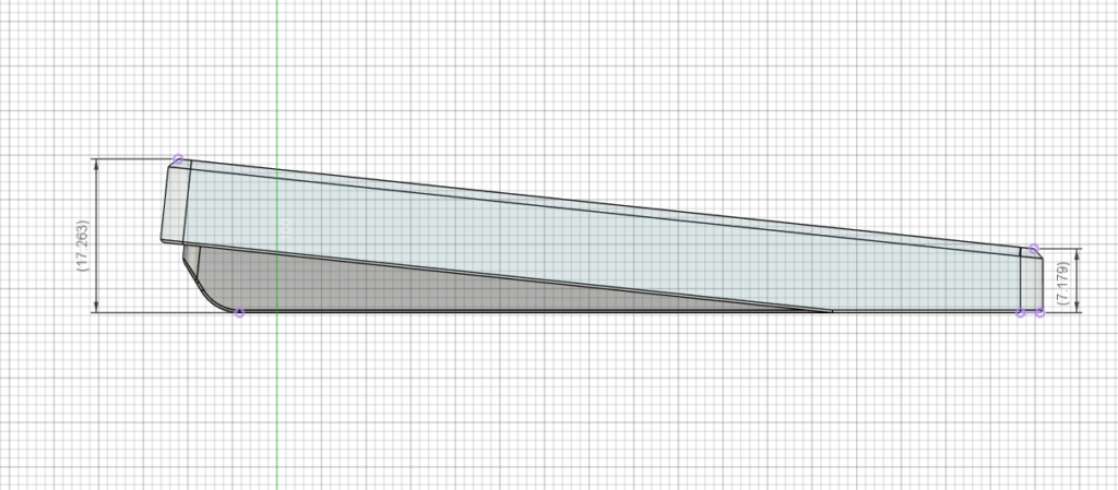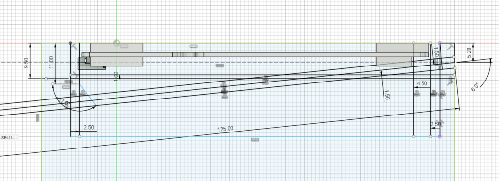 側面の図。手前側はスイッチの中央ピンがギリギリまで詰めて薄くしようとしています。チルト角は6度にしました。7度は打ちやすいのですが少々角度つきすぎだろと感じることもあるので6度がバランスいいのかなと思っています。
