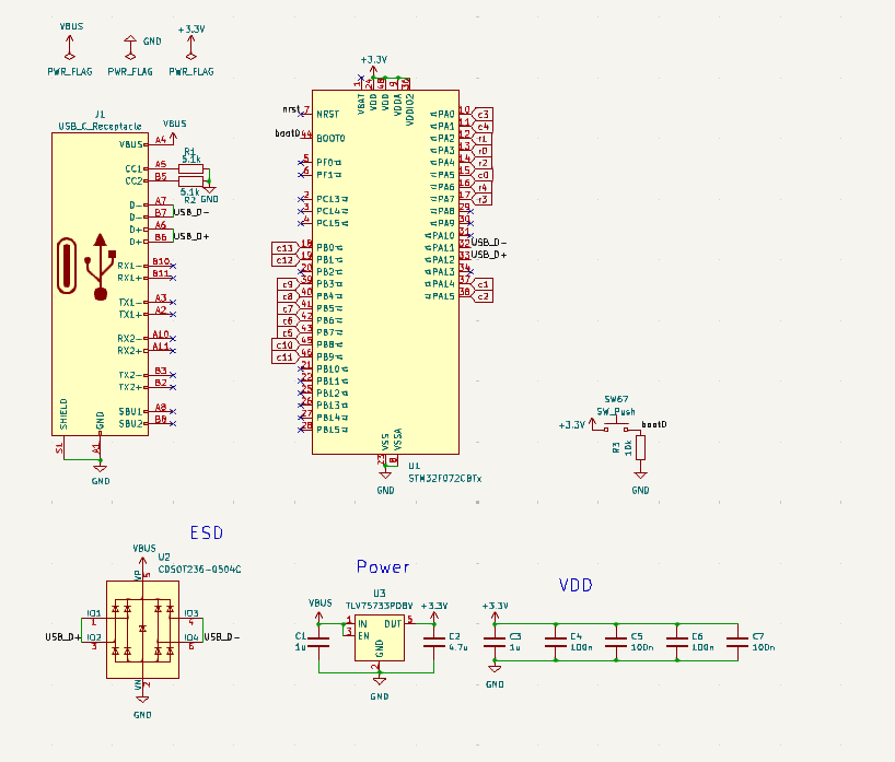 引き続きマイコンはstm32f072のリードタイプを使用します。リセットボタンは結局使わないので載せずブートボタンだけ載せています。