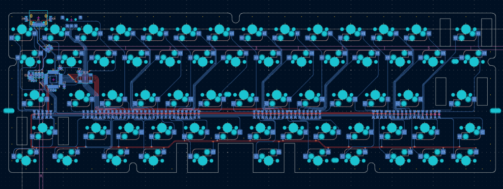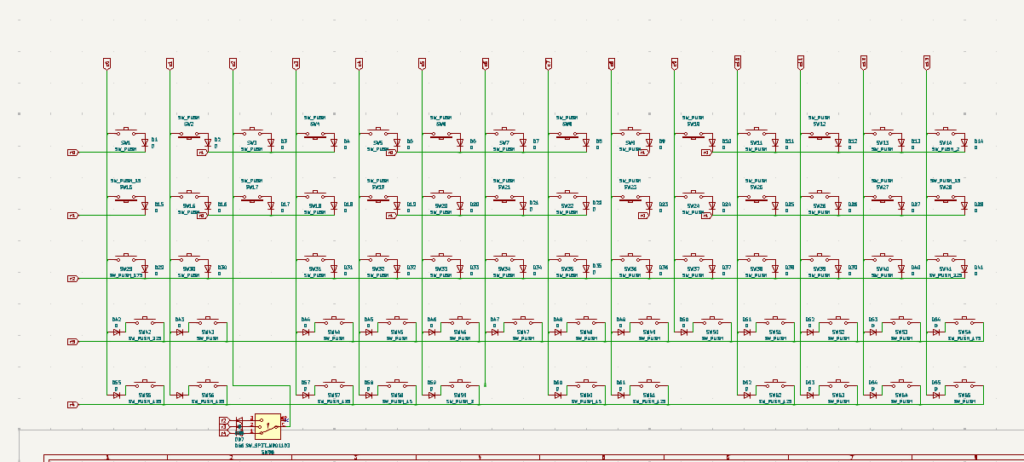 微妙なのはキースイッチの向きが上向いたりした向いたりしていることです。マイコン周りまとめて配置したかったのと、結局中段はgh60穴の干渉があるのでHのソケットを下側につける必要が出てきますので行丸ごと下側に配置しました。
